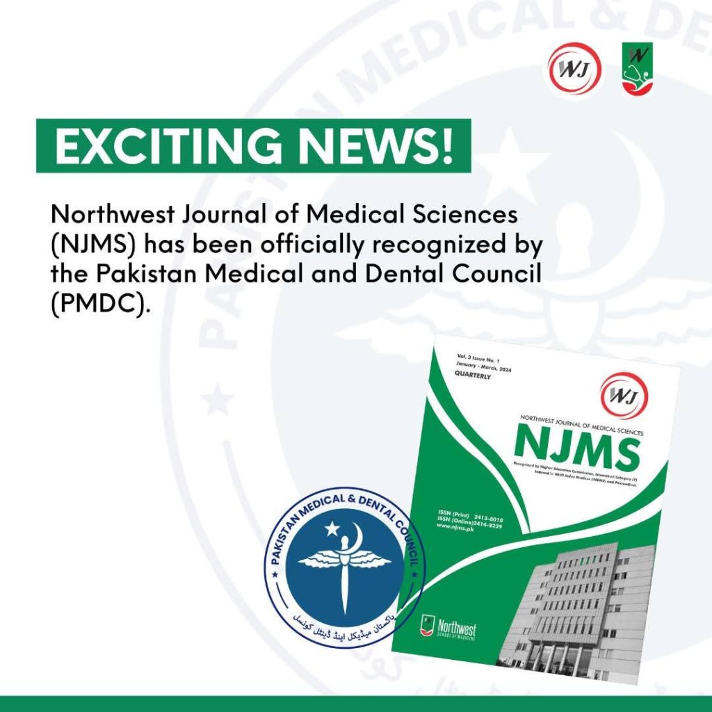 Northwest Journal of Medical Sciences (NJMS) has been recognized by the Higher Education Commission (HEC) and Pakistan Medical & Dental Council (PM&DC). For submission of original articles, go to the following link and register: www.njms.pk.